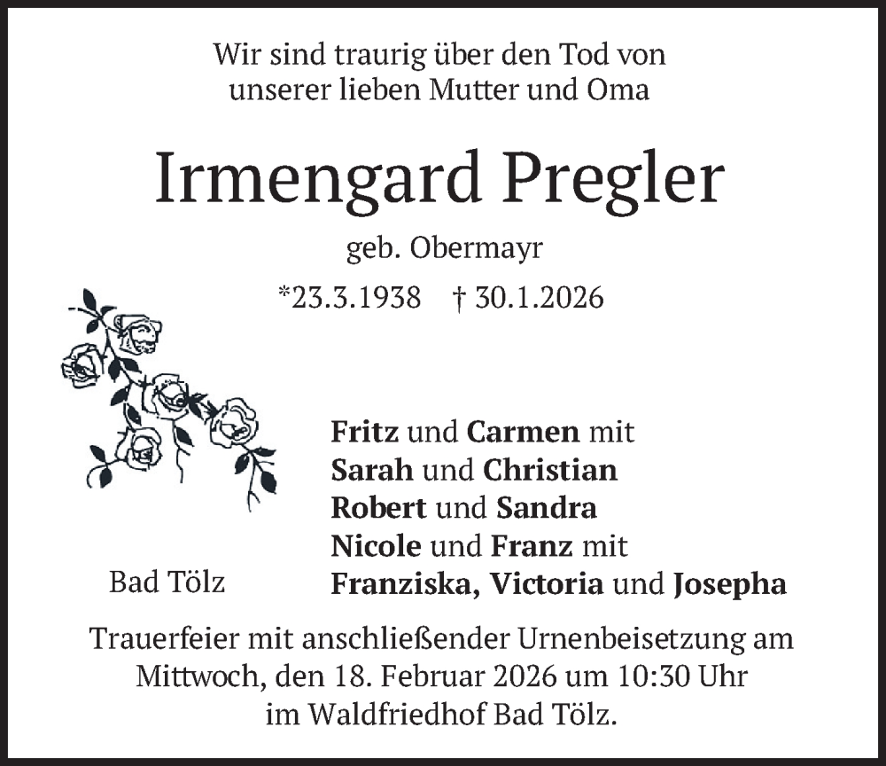 Hier finden Sie alle Traueranzeigen aus der Zeitung, die bisher für Irmengard Pregler erschienen sind. Weitere Traueranzeigen, die in der Zeitung erscheinen, werden hier ebenfalls aufgelistet
