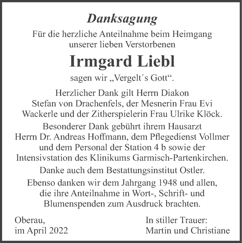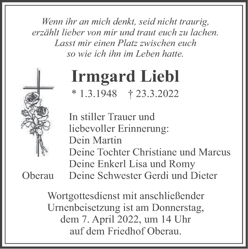 Hier finden Sie alle Traueranzeigen aus der Zeitung, die bisher für Irmgard Liebl erschienen sind. Weitere Traueranzeigen, die in der Zeitung erscheinen, werden hier ebenfalls aufgelistet