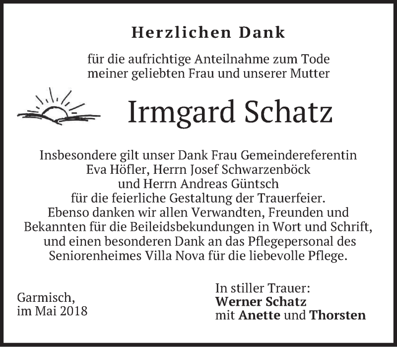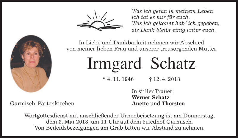 Hier finden Sie alle Traueranzeigen aus der Zeitung, die bisher für Irmgard Schatz erschienen sind. Weitere Traueranzeigen, die in der Zeitung erscheinen, werden hier ebenfalls aufgelistet