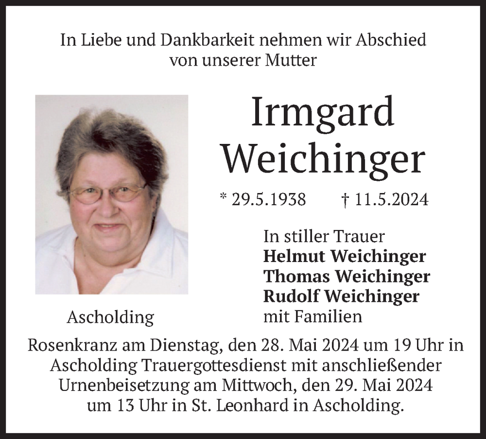 Hier finden Sie alle Traueranzeigen aus der Zeitung, die bisher für Irmgard Weichinger erschienen sind. Weitere Traueranzeigen, die in der Zeitung erscheinen, werden hier ebenfalls aufgelistet