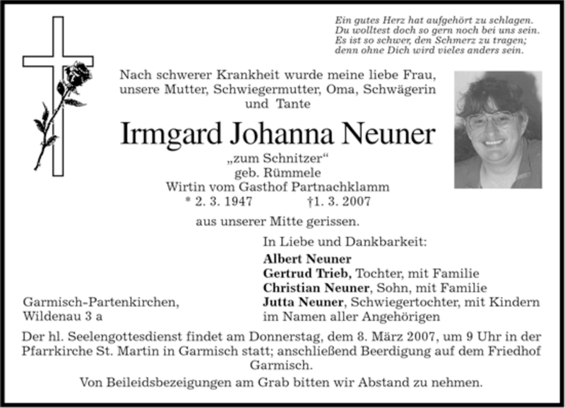 Hier finden Sie alle Traueranzeigen aus der Zeitung, die bisher für Irmgard Johanna Neuner erschienen sind. Weitere Traueranzeigen, die in der Zeitung erscheinen, werden hier ebenfalls aufgelistet