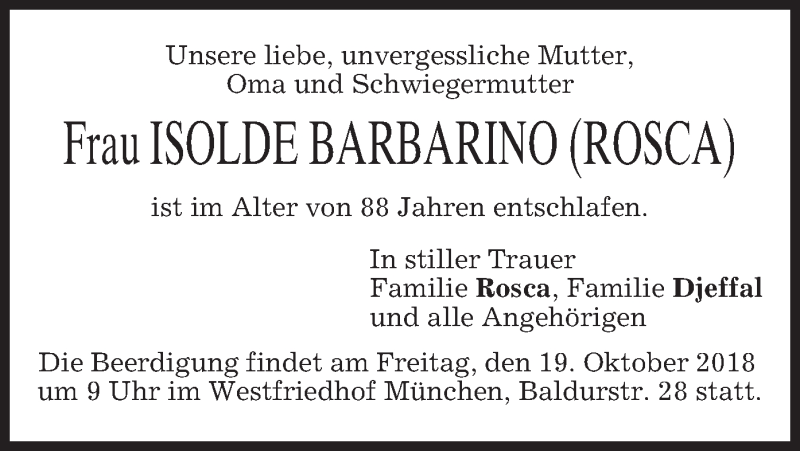 Hier finden Sie alle Traueranzeigen aus der Zeitung, die bisher für Isolde Barbarino erschienen sind. Weitere Traueranzeigen, die in der Zeitung erscheinen, werden hier ebenfalls aufgelistet