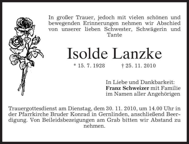 Hier finden Sie alle Traueranzeigen aus der Zeitung, die bisher für Isolde Lanzke erschienen sind. Weitere Traueranzeigen, die in der Zeitung erscheinen, werden hier ebenfalls aufgelistet