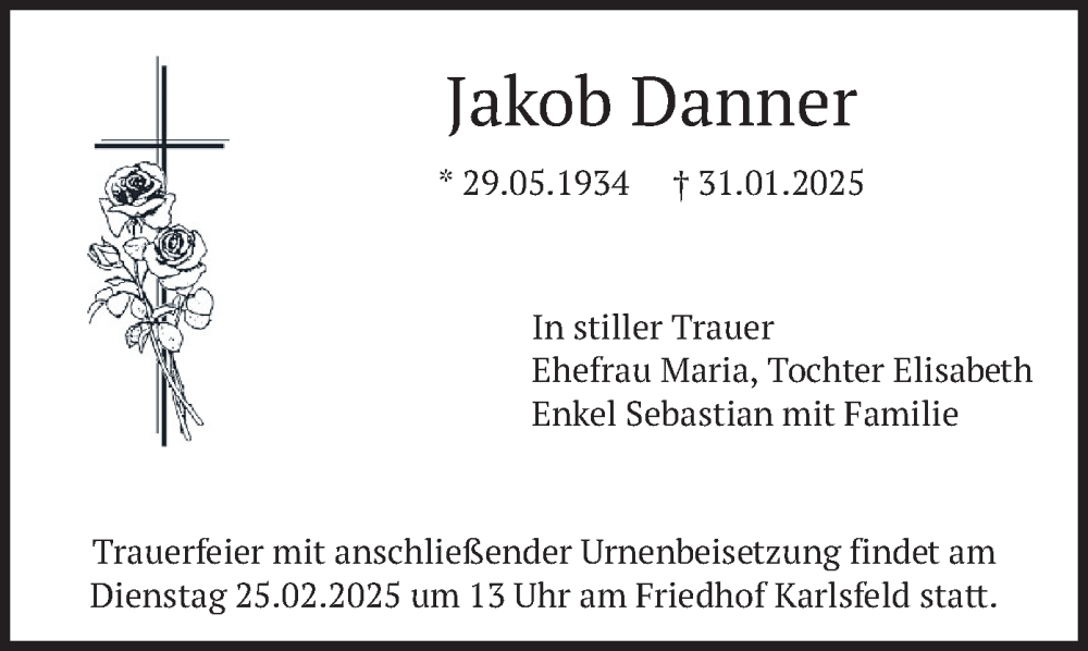 Hier finden Sie alle Traueranzeigen aus der Zeitung, die bisher für Jakob Danner erschienen sind. Weitere Traueranzeigen, die in der Zeitung erscheinen, werden hier ebenfalls aufgelistet