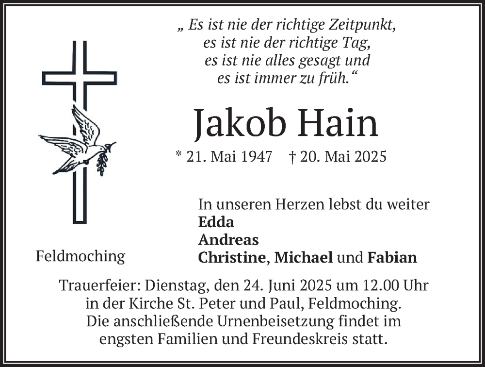Hier finden Sie alle Traueranzeigen aus der Zeitung, die bisher für Jakob Hain erschienen sind. Weitere Traueranzeigen, die in der Zeitung erscheinen, werden hier ebenfalls aufgelistet