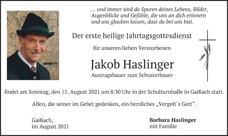 Hier finden Sie alle Traueranzeigen aus der Zeitung, die bisher für Jakob Haslinger erschienen sind. Weitere Traueranzeigen, die in der Zeitung erscheinen, werden hier ebenfalls aufgelistet