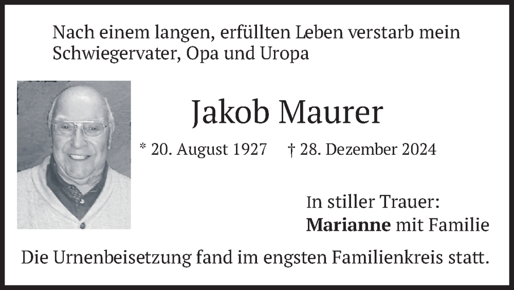 Hier finden Sie alle Traueranzeigen aus der Zeitung, die bisher für Jakob Maurer erschienen sind. Weitere Traueranzeigen, die in der Zeitung erscheinen, werden hier ebenfalls aufgelistet