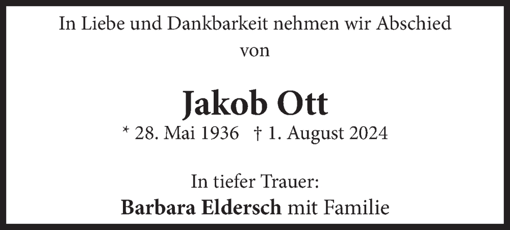Hier finden Sie alle Traueranzeigen aus der Zeitung, die bisher für Jakob Ott erschienen sind. Weitere Traueranzeigen, die in der Zeitung erscheinen, werden hier ebenfalls aufgelistet