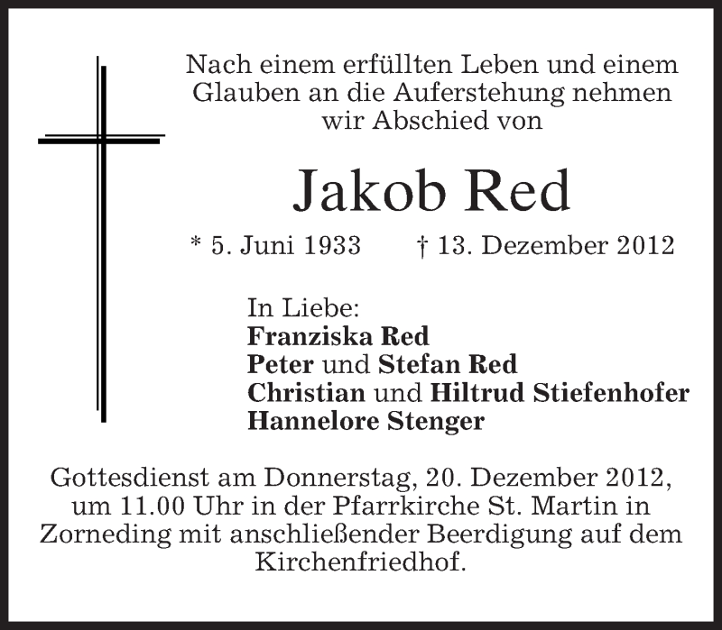 Hier finden Sie alle Traueranzeigen aus der Zeitung, die bisher für Jakob Red erschienen sind. Weitere Traueranzeigen, die in der Zeitung erscheinen, werden hier ebenfalls aufgelistet