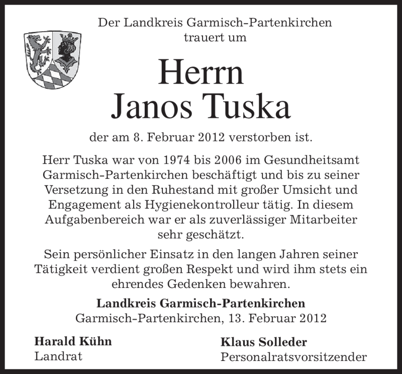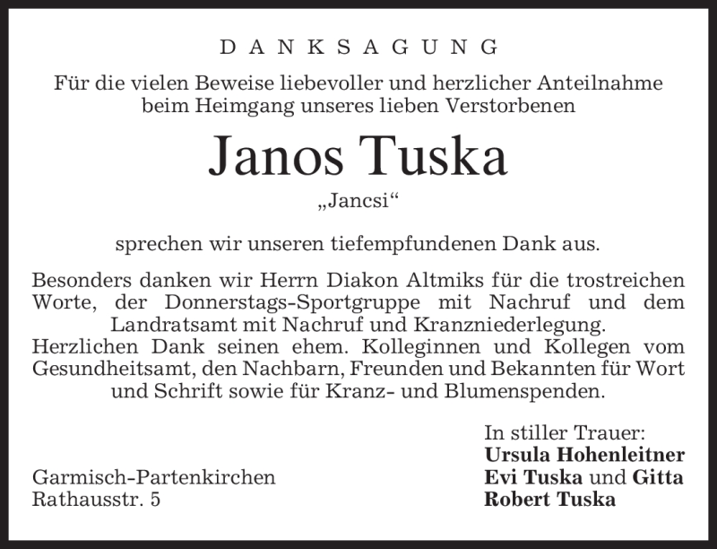 Hier finden Sie alle Traueranzeigen aus der Zeitung, die bisher für Janos Tuska erschienen sind. Weitere Traueranzeigen, die in der Zeitung erscheinen, werden hier ebenfalls aufgelistet