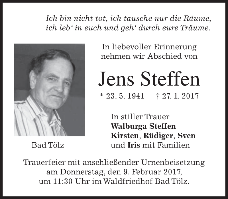 Hier finden Sie alle Traueranzeigen aus der Zeitung, die bisher für Jens Steffen erschienen sind. Weitere Traueranzeigen, die in der Zeitung erscheinen, werden hier ebenfalls aufgelistet