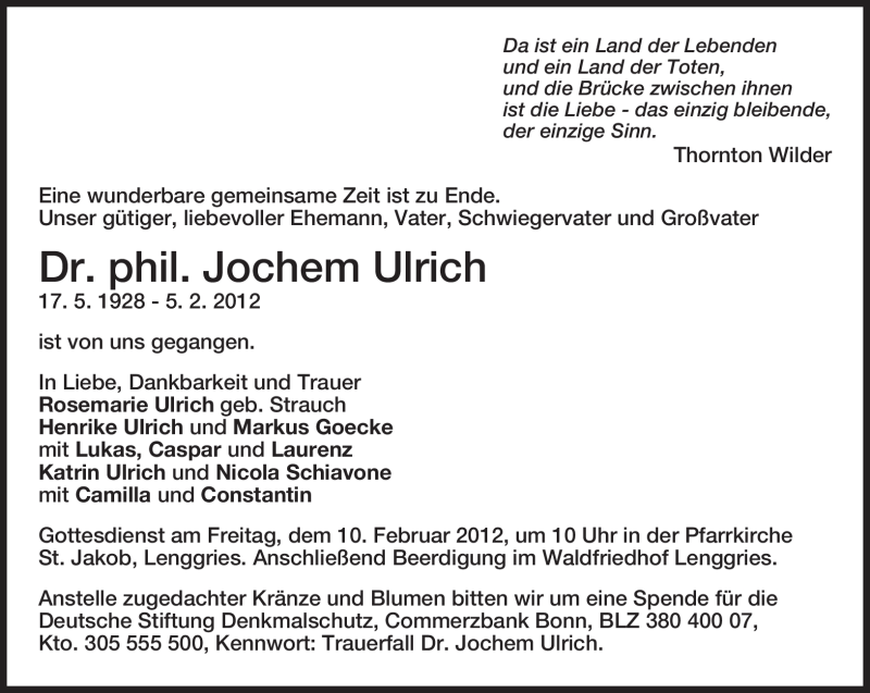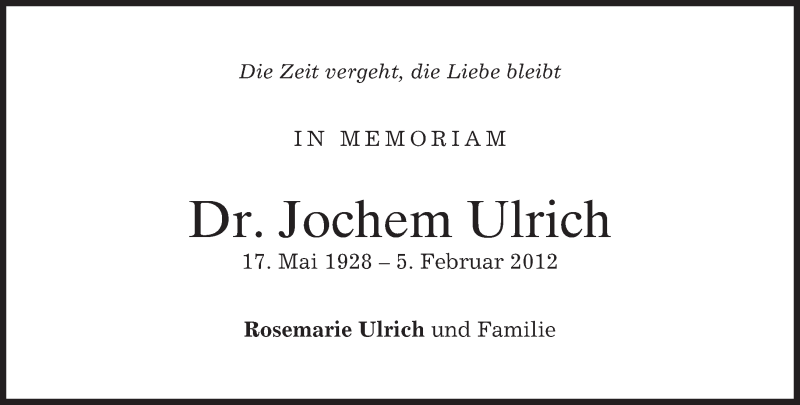Hier finden Sie alle Traueranzeigen aus der Zeitung, die bisher für Jochem Ulrich erschienen sind. Weitere Traueranzeigen, die in der Zeitung erscheinen, werden hier ebenfalls aufgelistet