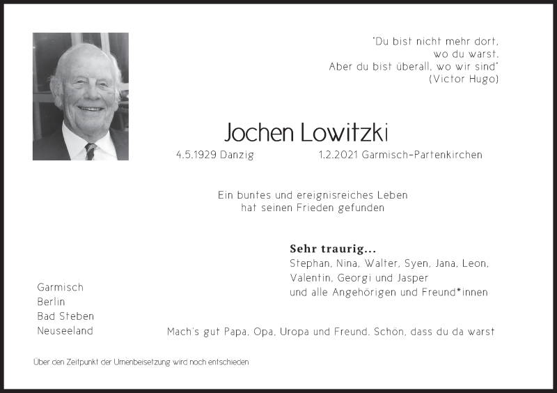 Hier finden Sie alle Traueranzeigen aus der Zeitung, die bisher für Jochen Lowitzki erschienen sind. Weitere Traueranzeigen, die in der Zeitung erscheinen, werden hier ebenfalls aufgelistet
