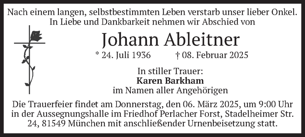 Hier finden Sie alle Traueranzeigen aus der Zeitung, die bisher für Johann Ableitner erschienen sind. Weitere Traueranzeigen, die in der Zeitung erscheinen, werden hier ebenfalls aufgelistet