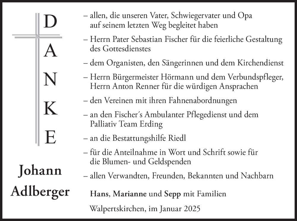 Hier finden Sie alle Traueranzeigen aus der Zeitung, die bisher für Johann Adlberger erschienen sind. Weitere Traueranzeigen, die in der Zeitung erscheinen, werden hier ebenfalls aufgelistet
