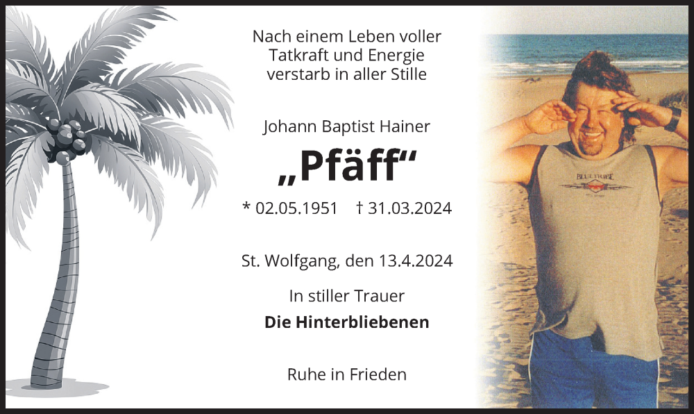 Hier finden Sie alle Traueranzeigen aus der Zeitung, die bisher für Johann Baptist Hainer erschienen sind. Weitere Traueranzeigen, die in der Zeitung erscheinen, werden hier ebenfalls aufgelistet