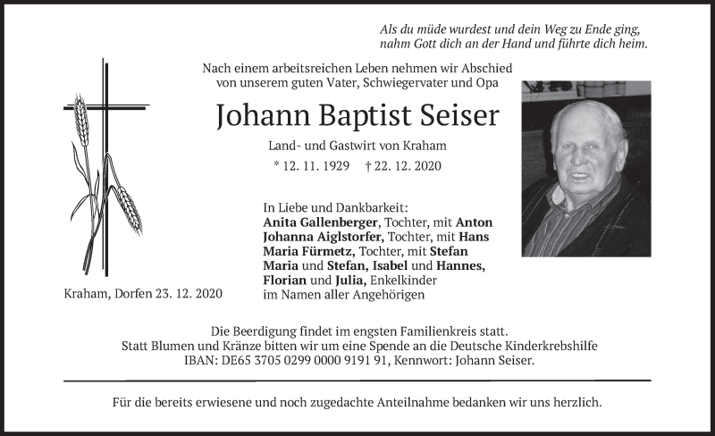 Hier finden Sie alle Traueranzeigen aus der Zeitung, die bisher für Johann Baptist Seiser erschienen sind. Weitere Traueranzeigen, die in der Zeitung erscheinen, werden hier ebenfalls aufgelistet