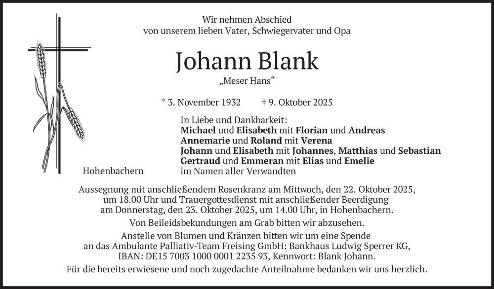 Hier finden Sie alle Traueranzeigen aus der Zeitung, die bisher für Johann Blank erschienen sind. Weitere Traueranzeigen, die in der Zeitung erscheinen, werden hier ebenfalls aufgelistet