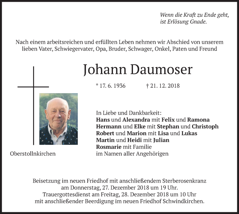 Hier finden Sie alle Traueranzeigen aus der Zeitung, die bisher für Johann Daumoser erschienen sind. Weitere Traueranzeigen, die in der Zeitung erscheinen, werden hier ebenfalls aufgelistet