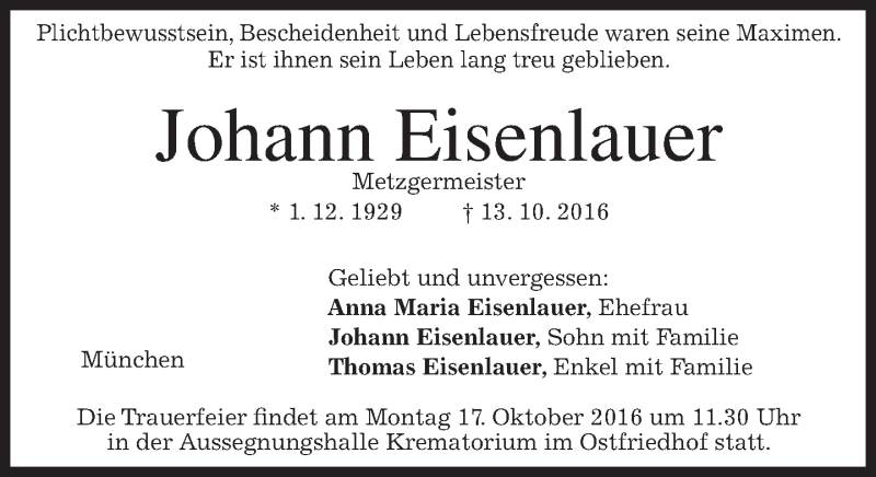 Hier finden Sie alle Traueranzeigen aus der Zeitung, die bisher für Johann Eisenlauer erschienen sind. Weitere Traueranzeigen, die in der Zeitung erscheinen, werden hier ebenfalls aufgelistet