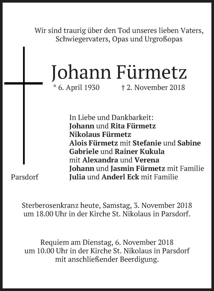 Hier finden Sie alle Traueranzeigen aus der Zeitung, die bisher für Johann Fürmetz erschienen sind. Weitere Traueranzeigen, die in der Zeitung erscheinen, werden hier ebenfalls aufgelistet