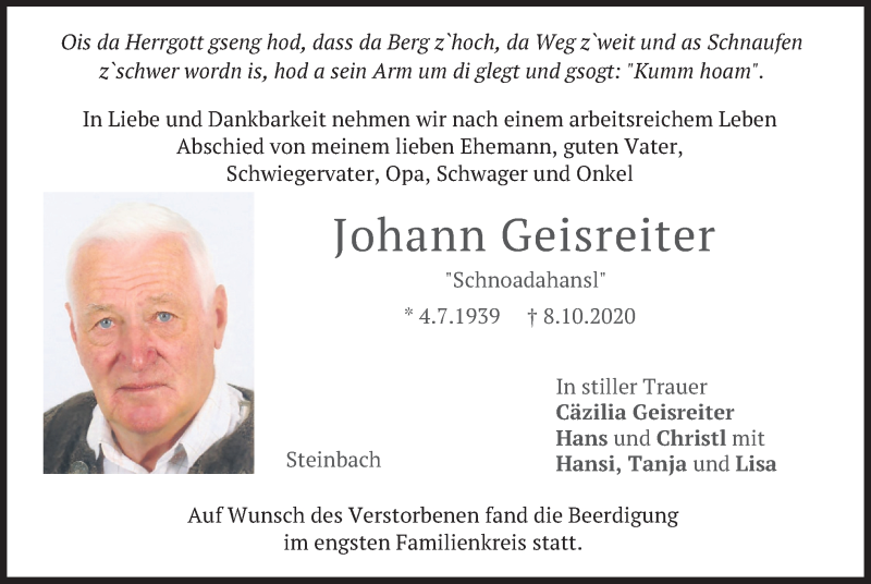 Hier finden Sie alle Traueranzeigen aus der Zeitung, die bisher für Johann Geisreiter erschienen sind. Weitere Traueranzeigen, die in der Zeitung erscheinen, werden hier ebenfalls aufgelistet