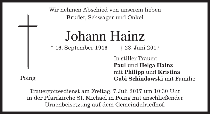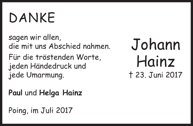Hier finden Sie alle Traueranzeigen aus der Zeitung, die bisher für Johann Hainz erschienen sind. Weitere Traueranzeigen, die in der Zeitung erscheinen, werden hier ebenfalls aufgelistet