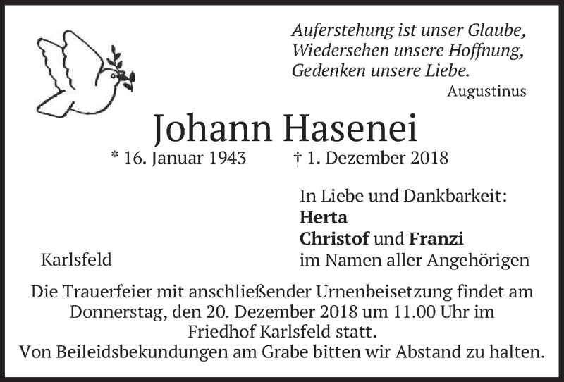 Hier finden Sie alle Traueranzeigen aus der Zeitung, die bisher für Johann Hasenei erschienen sind. Weitere Traueranzeigen, die in der Zeitung erscheinen, werden hier ebenfalls aufgelistet