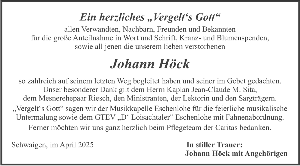 Hier finden Sie alle Traueranzeigen aus der Zeitung, die bisher für Johann Höck erschienen sind. Weitere Traueranzeigen, die in der Zeitung erscheinen, werden hier ebenfalls aufgelistet