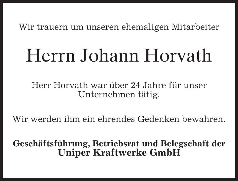 Hier finden Sie alle Traueranzeigen aus der Zeitung, die bisher für Johann Horvath erschienen sind. Weitere Traueranzeigen, die in der Zeitung erscheinen, werden hier ebenfalls aufgelistet
