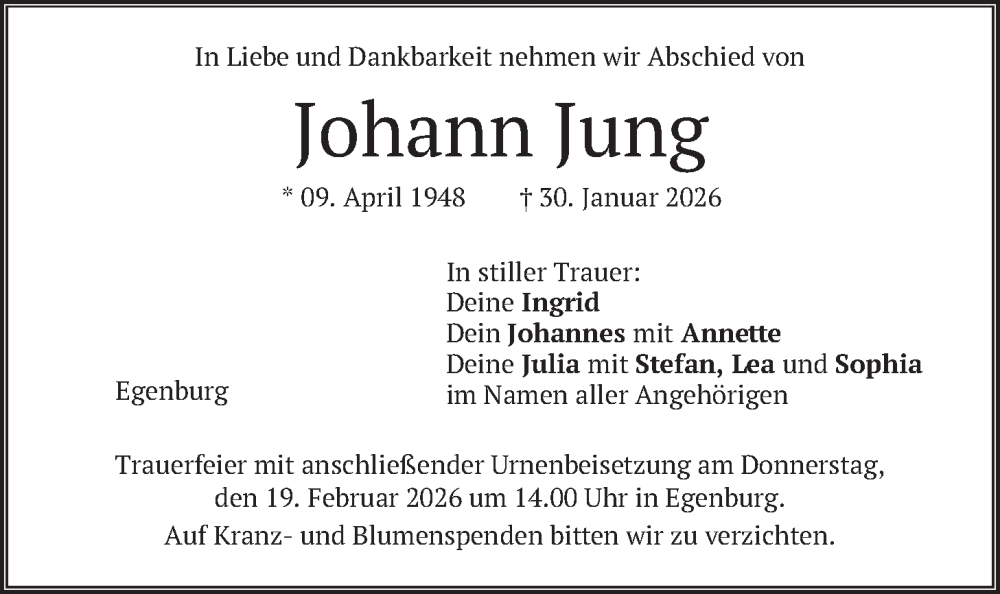 Hier finden Sie alle Traueranzeigen aus der Zeitung, die bisher für Johann Jung erschienen sind. Weitere Traueranzeigen, die in der Zeitung erscheinen, werden hier ebenfalls aufgelistet