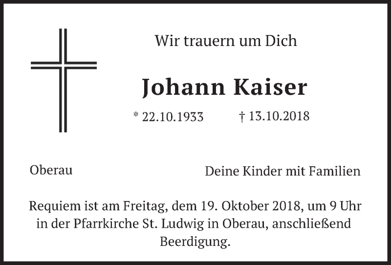Hier finden Sie alle Traueranzeigen aus der Zeitung, die bisher für Johann Kaiser erschienen sind. Weitere Traueranzeigen, die in der Zeitung erscheinen, werden hier ebenfalls aufgelistet