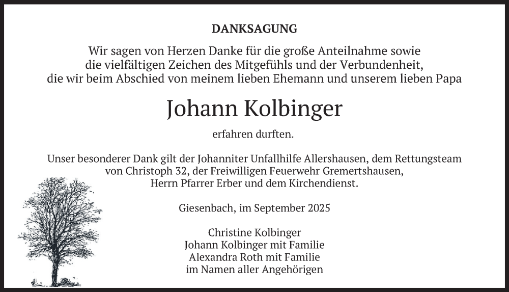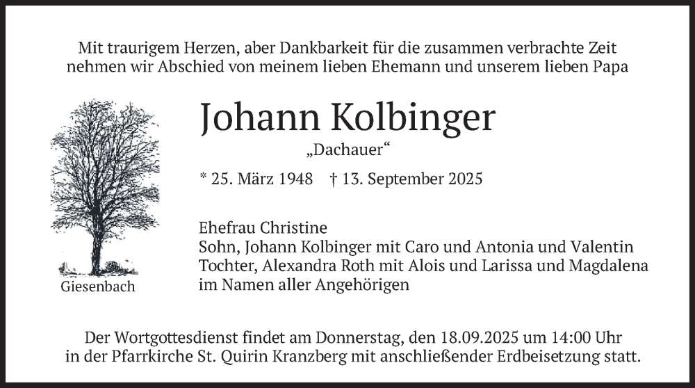 Hier finden Sie alle Traueranzeigen aus der Zeitung, die bisher für Johann Kolbinger erschienen sind. Weitere Traueranzeigen, die in der Zeitung erscheinen, werden hier ebenfalls aufgelistet