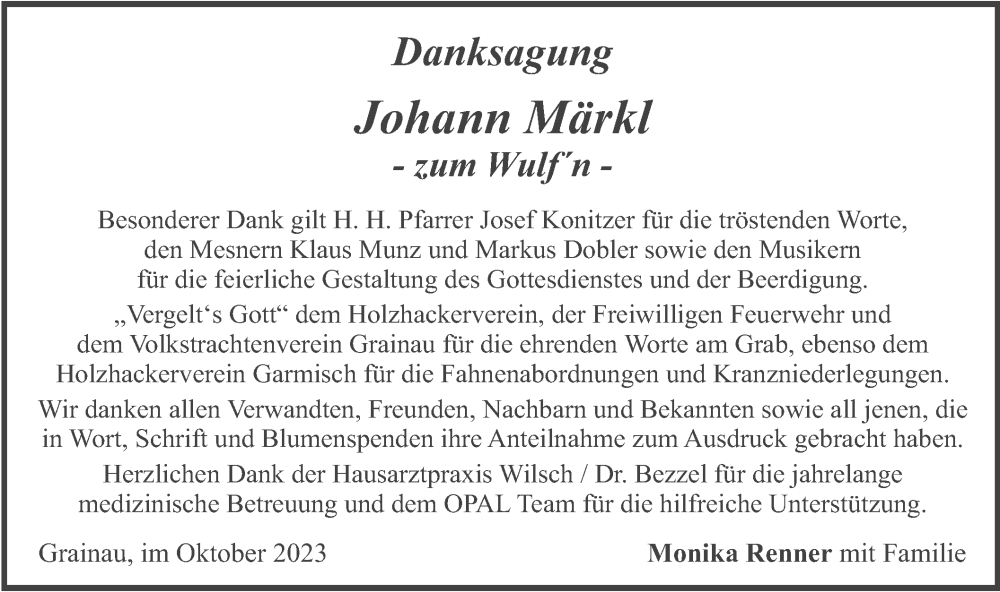 Hier finden Sie alle Traueranzeigen aus der Zeitung, die bisher für Johann Märkl erschienen sind. Weitere Traueranzeigen, die in der Zeitung erscheinen, werden hier ebenfalls aufgelistet