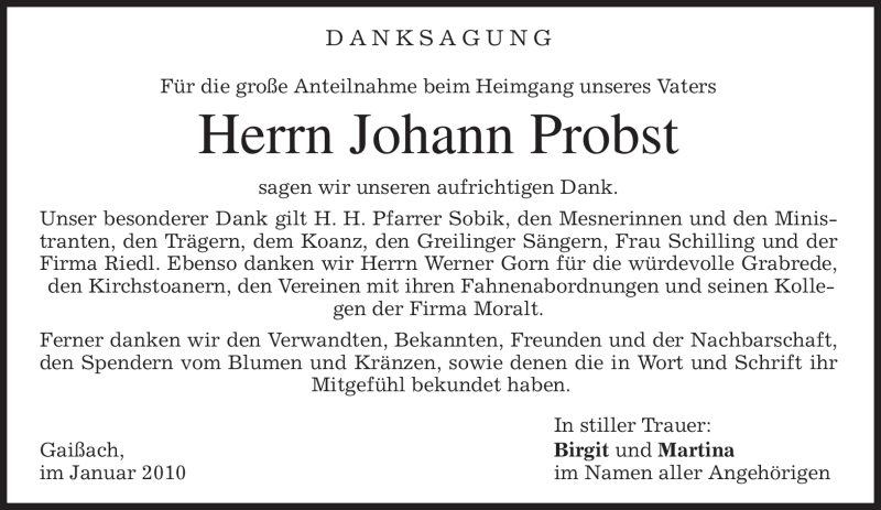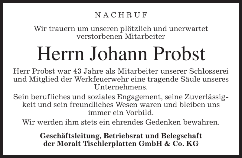Hier finden Sie alle Traueranzeigen aus der Zeitung, die bisher für Johann Probst erschienen sind. Weitere Traueranzeigen, die in der Zeitung erscheinen, werden hier ebenfalls aufgelistet