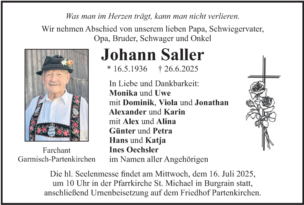 Hier finden Sie alle Traueranzeigen aus der Zeitung, die bisher für Johann Saller erschienen sind. Weitere Traueranzeigen, die in der Zeitung erscheinen, werden hier ebenfalls aufgelistet