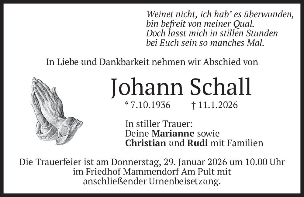 Hier finden Sie alle Traueranzeigen aus der Zeitung, die bisher für Johann Schall erschienen sind. Weitere Traueranzeigen, die in der Zeitung erscheinen, werden hier ebenfalls aufgelistet
