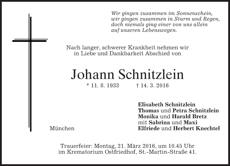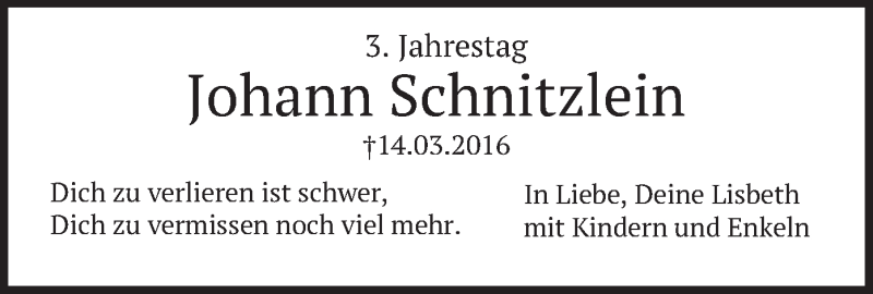 Hier finden Sie alle Traueranzeigen aus der Zeitung, die bisher für Johann Schnitzlein erschienen sind. Weitere Traueranzeigen, die in der Zeitung erscheinen, werden hier ebenfalls aufgelistet