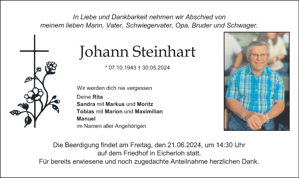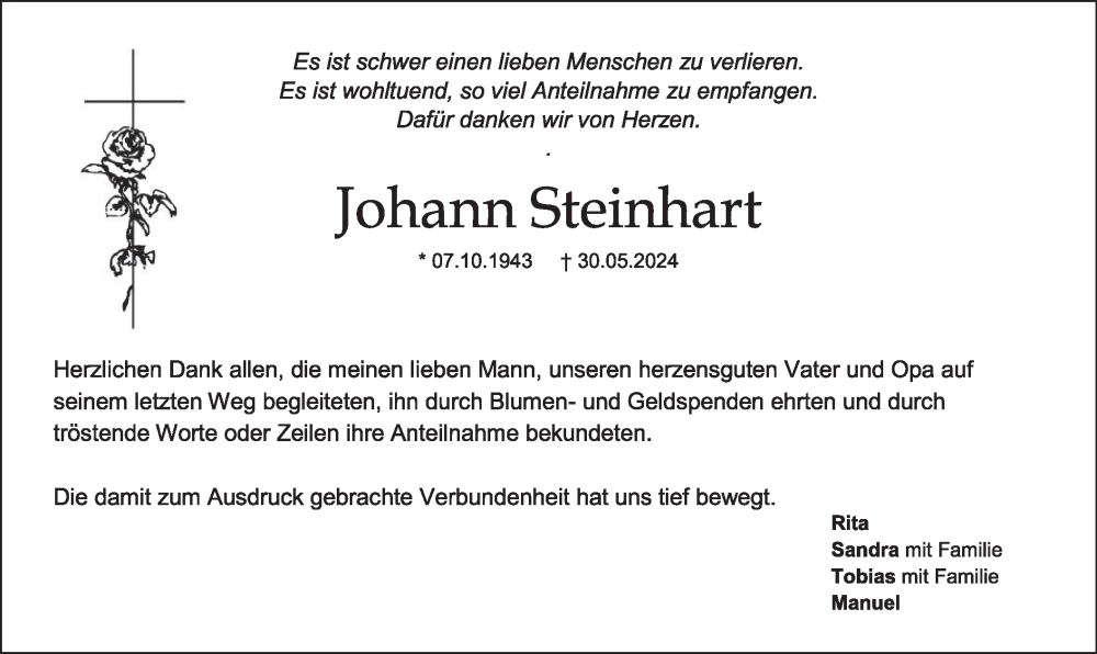 Hier finden Sie alle Traueranzeigen aus der Zeitung, die bisher für Johann Steinhart erschienen sind. Weitere Traueranzeigen, die in der Zeitung erscheinen, werden hier ebenfalls aufgelistet