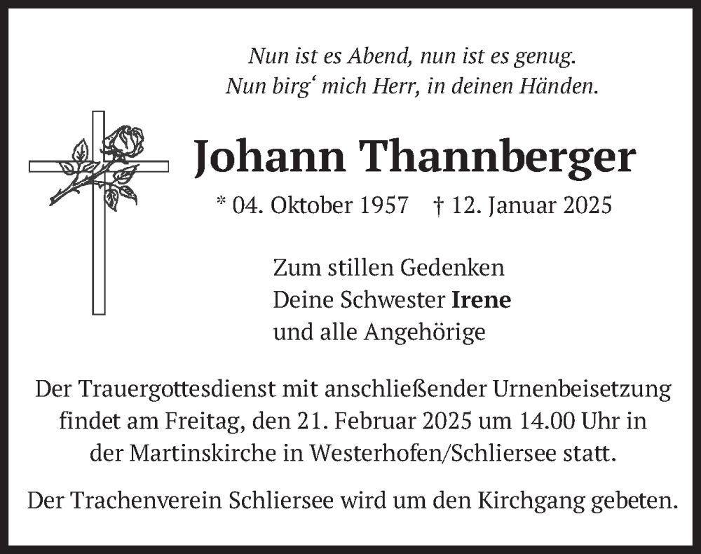 Hier finden Sie alle Traueranzeigen aus der Zeitung, die bisher für Johann Thannberger erschienen sind. Weitere Traueranzeigen, die in der Zeitung erscheinen, werden hier ebenfalls aufgelistet