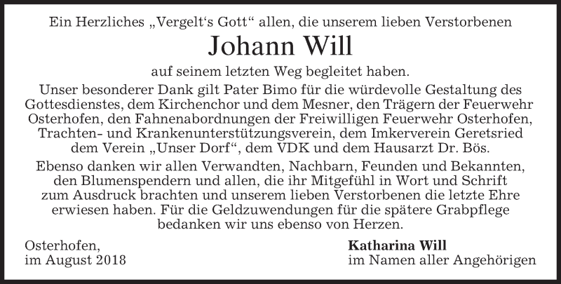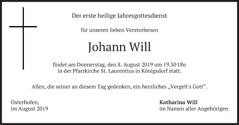 Hier finden Sie alle Traueranzeigen aus der Zeitung, die bisher für Johann Will erschienen sind. Weitere Traueranzeigen, die in der Zeitung erscheinen, werden hier ebenfalls aufgelistet