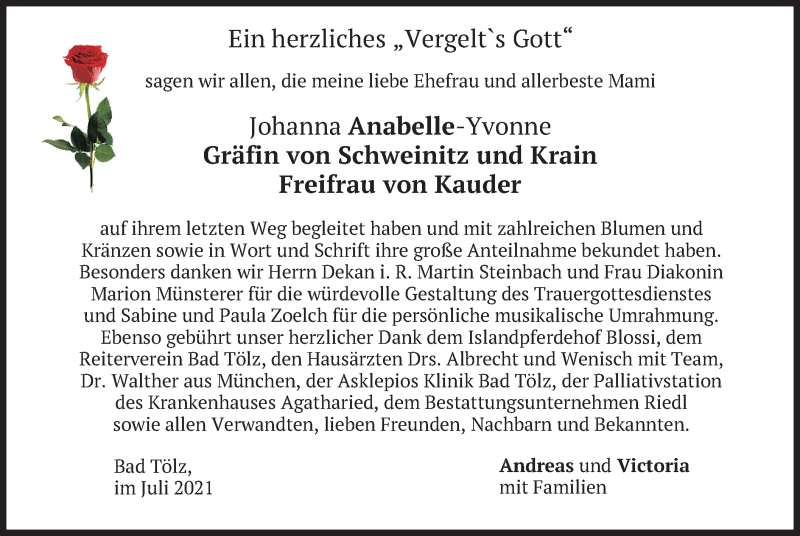 Hier finden Sie alle Traueranzeigen aus der Zeitung, die bisher für Johanna Anabelle-Yvonne Gräfin von Schweinitz und Krain Freifrau von Kauder erschienen sind. Weitere Traueranzeigen, die in der Zeitung erscheinen, werden hier ebenfalls aufgelistet