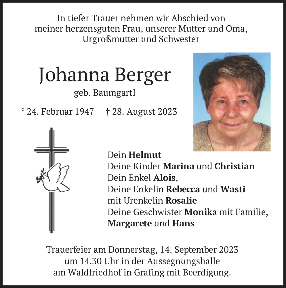 Hier finden Sie alle Traueranzeigen aus der Zeitung, die bisher für Johanna Berger erschienen sind. Weitere Traueranzeigen, die in der Zeitung erscheinen, werden hier ebenfalls aufgelistet
