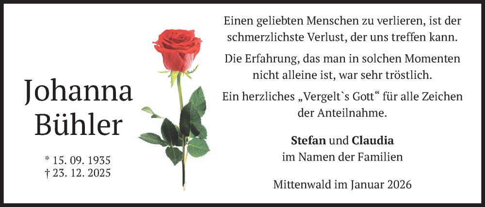Hier finden Sie alle Traueranzeigen aus der Zeitung, die bisher für Johanna Bühler erschienen sind. Weitere Traueranzeigen, die in der Zeitung erscheinen, werden hier ebenfalls aufgelistet