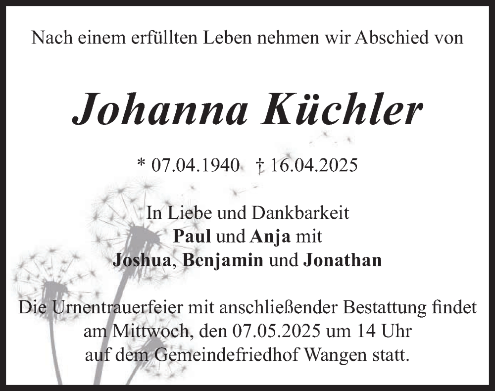Hier finden Sie alle Traueranzeigen aus der Zeitung, die bisher für Johanna Küchler erschienen sind. Weitere Traueranzeigen, die in der Zeitung erscheinen, werden hier ebenfalls aufgelistet