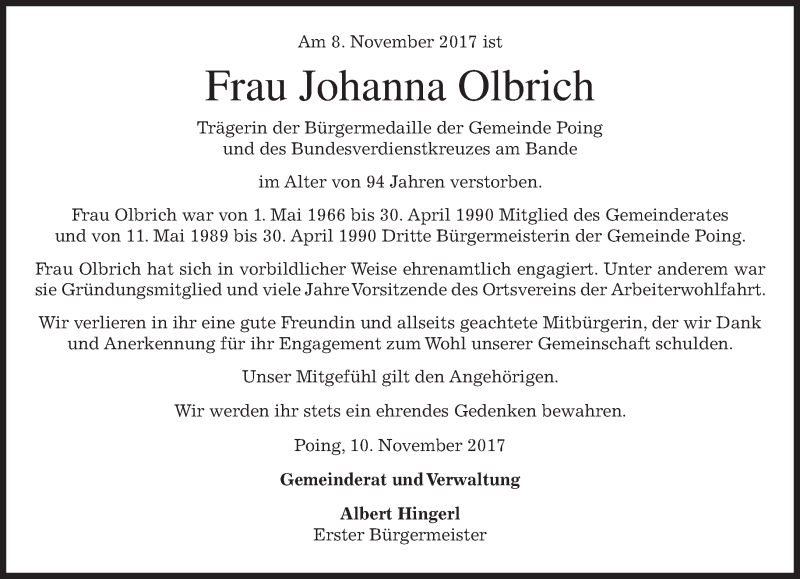 Hier finden Sie alle Traueranzeigen aus der Zeitung, die bisher für Johanna Olbrich erschienen sind. Weitere Traueranzeigen, die in der Zeitung erscheinen, werden hier ebenfalls aufgelistet