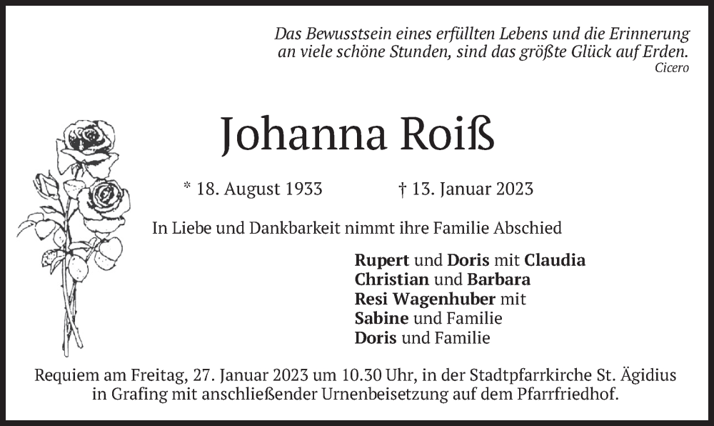 Hier finden Sie alle Traueranzeigen aus der Zeitung, die bisher für Johanna Roiß erschienen sind. Weitere Traueranzeigen, die in der Zeitung erscheinen, werden hier ebenfalls aufgelistet