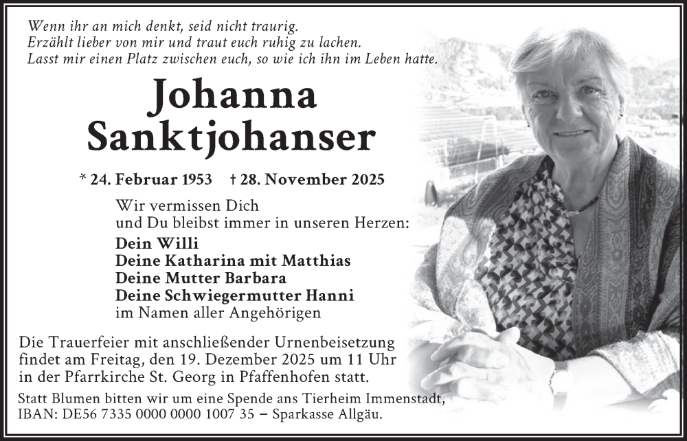 Hier finden Sie alle Traueranzeigen aus der Zeitung, die bisher für Johanna Sanktjohanser erschienen sind. Weitere Traueranzeigen, die in der Zeitung erscheinen, werden hier ebenfalls aufgelistet