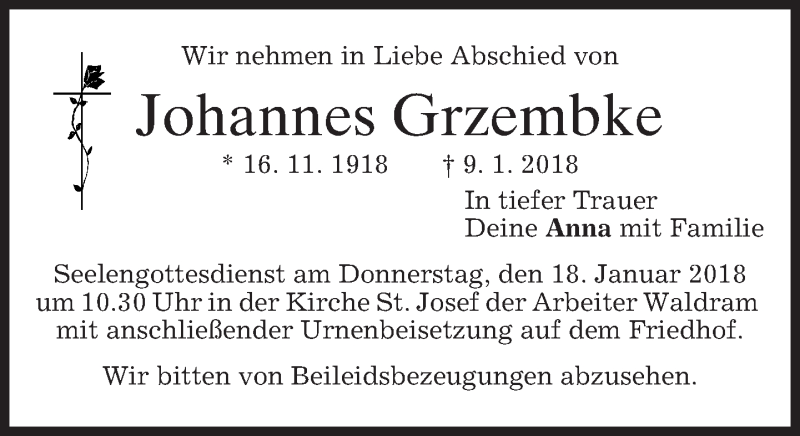 Hier finden Sie alle Traueranzeigen aus der Zeitung, die bisher für Johannes Grzembke erschienen sind. Weitere Traueranzeigen, die in der Zeitung erscheinen, werden hier ebenfalls aufgelistet