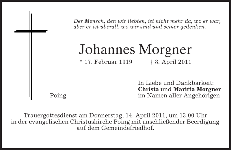 Hier finden Sie alle Traueranzeigen aus der Zeitung, die bisher für Johannes Morgner erschienen sind. Weitere Traueranzeigen, die in der Zeitung erscheinen, werden hier ebenfalls aufgelistet